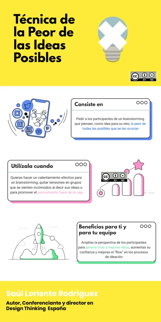 Existen muchas técnicas y herramientas de las que puedes servirte para afrontar estas situaciones. De todas ellas, voy a hablarte de una que creamos en Design Thinking España, a la que llamamos «La peor de las ideas posibles». Y de lo qué puede aportarte, y de qué manera, la utilización de esta técnica.