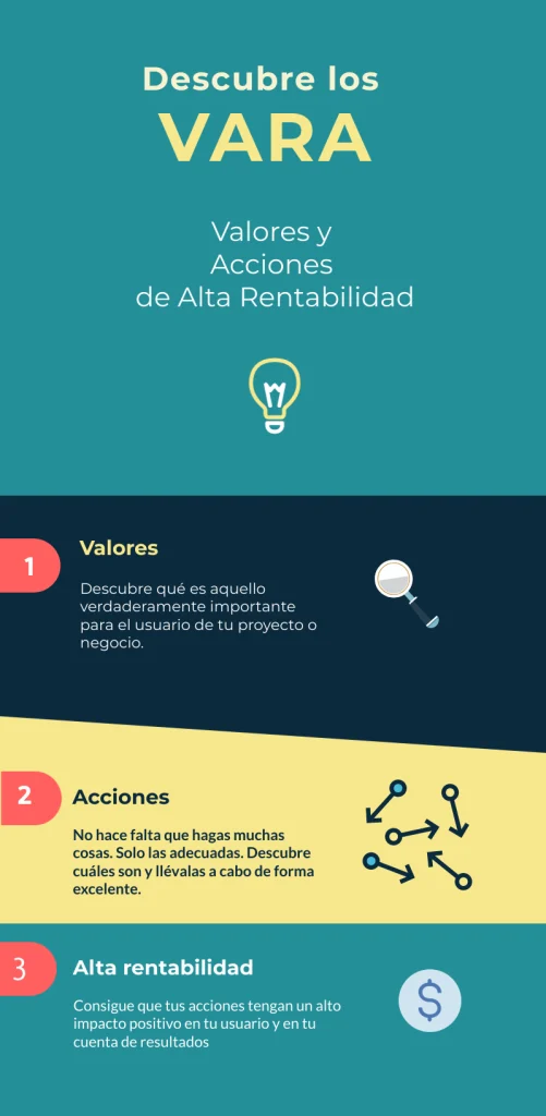 Después de todo lo que te he contado, es el momento de explicarte con más detenimiento el término VARA, acrónimo de «Valores y Acciones de Rentabilidad Alta». Y que aplican tanto para el usuario como para el negocio.